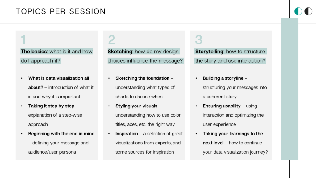 Studio Insight Out regularly facilitates training courses for a variety of clients. In interactive sessions participants learn about the design choices while creating data visualizations. By practicing on several example cases, they experience how these design choices determine the message/story the visualization brings across to the user.